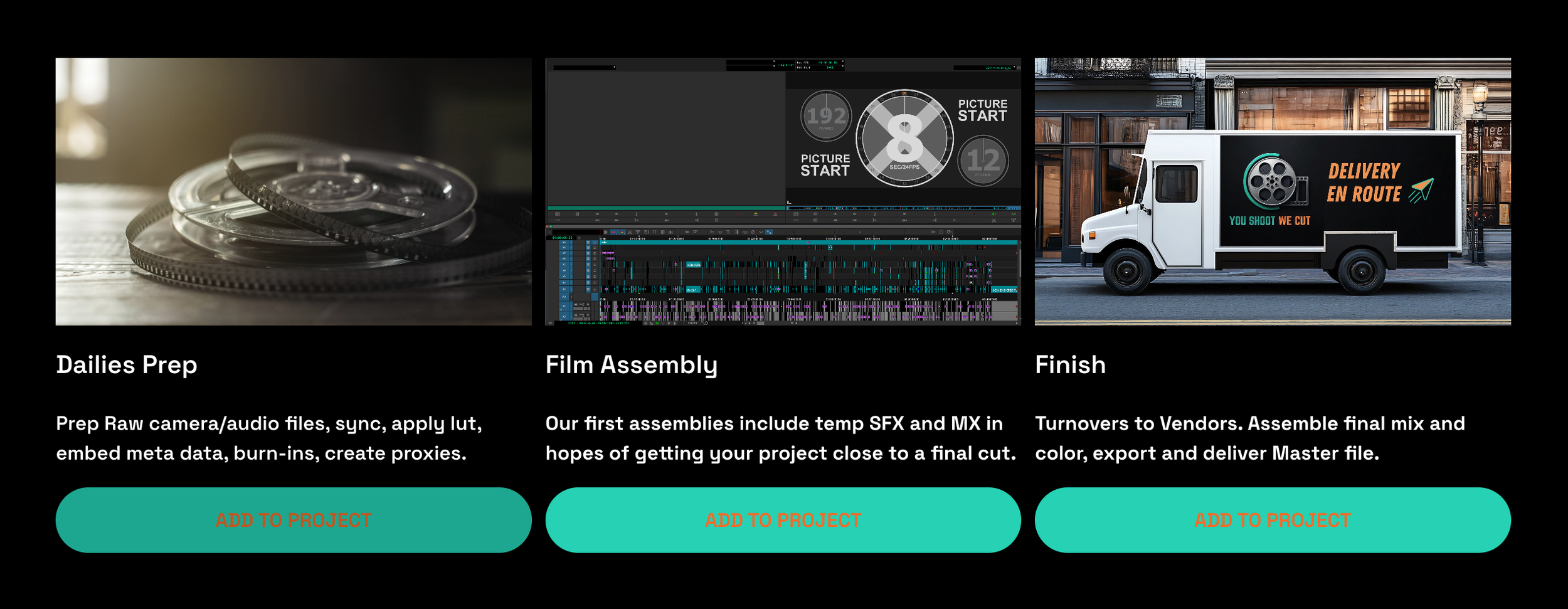 If you plan to finish in house, we have a Sound & Music Pass and a Color Pass service available.